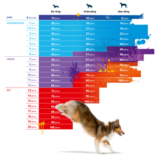 Hunde und Katzen gelten als alt, wenn sie 75% ihrer Lebenserwartung erreicht haben. Hier sehen Sie, wie alt ihr Hund in Menschenjahren ist.